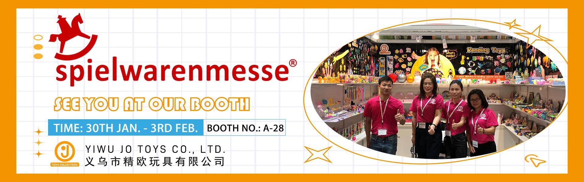 Yiwu JO Toys Co., Ltd. е основана през 2011 г., разположена в град Yiwu, провинция Zhejiang. Ние сме професионален производител, специализиран в изследване, разработване и производство на различни форми и размери на вендинг капсули, капсулни играчки, TPR играчки, вентилационни играчки, мигащи играчки, нови играчки и други. Всички наши продукти са изработени от екологично чист материал и могат да отговарят на международните стандарти за качество и са високо ценени на различни пазари по целия свят.